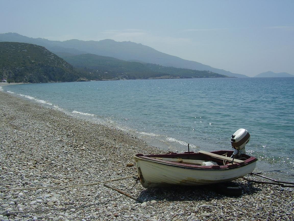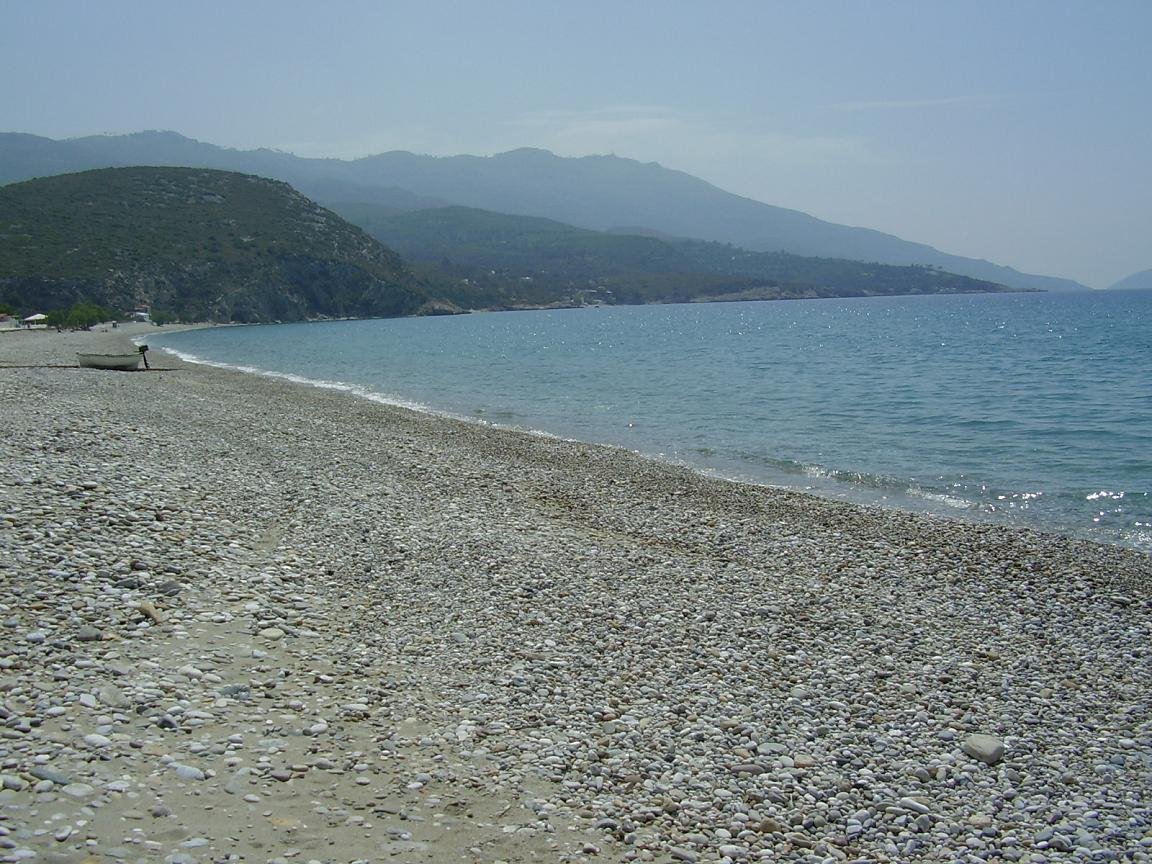 Balos is a quiet village in the south of Samos that is not situated on the main road, and so it is more peaceful than for instance Votsalakia and Kampos. It is set in a beautiful bay and it comes with a large, clean and quiet pebble beach, with clean waters. At the end of this long beach it seems to get a little bit better and there is a little bit more sand. There is a very limited number of sunbeds and parasols for rent on the beach, but for those that want to sit in the shade: there are a couple of large trees on the beach. At the very end of the beach there is also a cave. For those who want to burn a candle: the small church at the end of the road was open. It is not extremely pretty inside, or anything like that, but since most of the churches on Samos seem to be closed... I read also in guides that at the end of the village you could find a dirt track that you can follow to end up in the beach of Pefkos, but we never found it there: the road stopped. If you want to visit the beach of Pefkos you will see the signs at different points on the island (also just before you enter the village) but not here in Balos itself. |