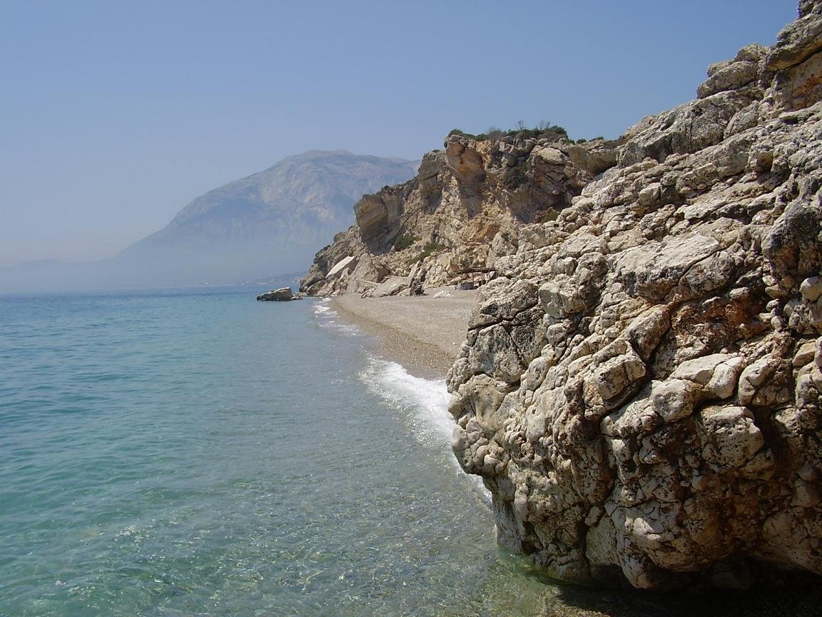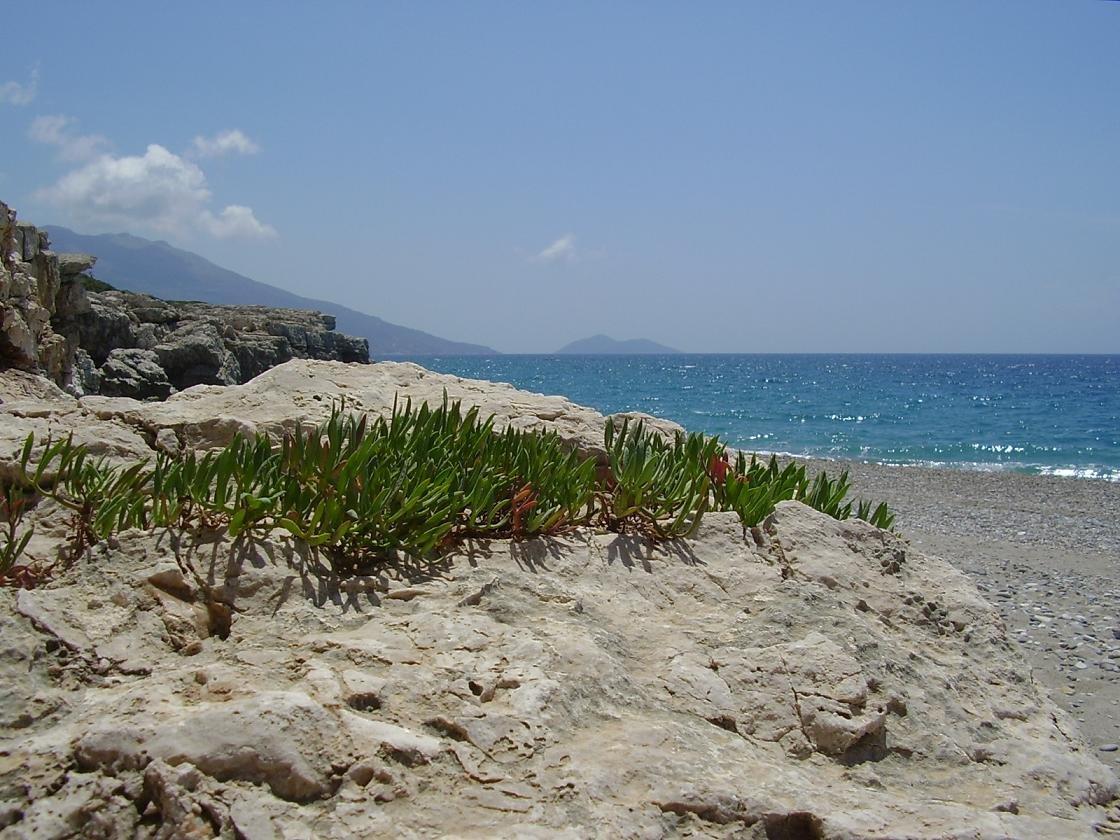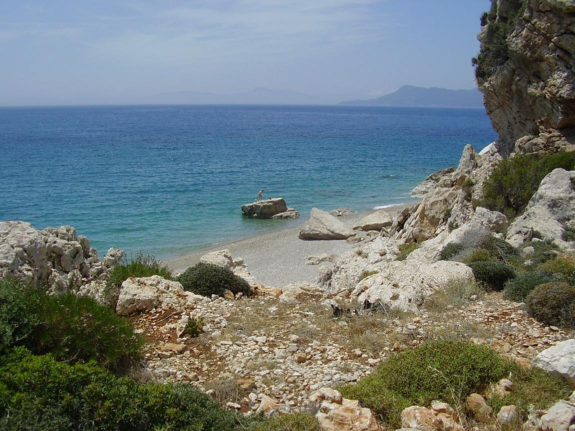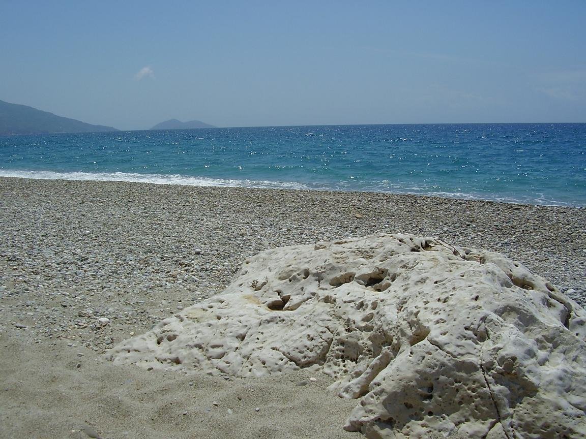 Next to Balos beach is another beautiful secret sandy beach, which is our favorite beach of the island - I believe sometimes it is referred to as Komeika Beach. In 2010 when we visited this beach and found it deserted (again...) we had a view of hundreds of dolphins. On the beach there used to be a wooden construction made by fishermen, where you could sit in the shade, but in 2010 it was removed. Now you can only find shade at certain times of the day and also in a small cave that is on the beach. This beach (sand and some pebbles) is close to the Panorama Villas (see hotel section) and next to it is yet another beach with a beautiful rock in front of it. We tried to get to this beach but we were not succesful. |