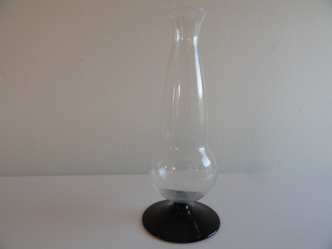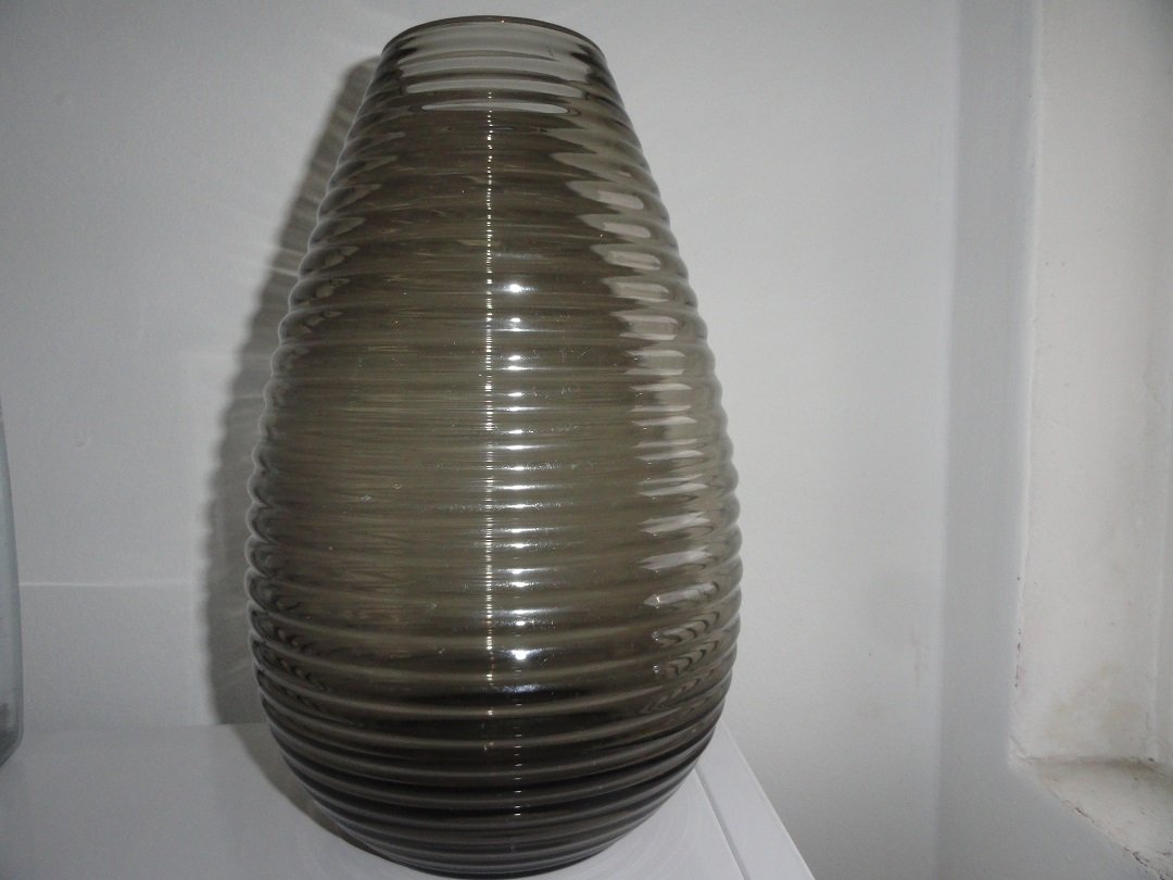 Copier fumi geringde vaas uit 1953, grootste maat druppelvorm - hoogte 29 cmDeze vaas is gemaakt in 1953, ontwerp van Andries Copier. Meestal wordt dit soort vazen een "ribbelvaas" genoemd. Hij heeft geen chips, beschadigingen of grote krassen. Een vaas in goede konditie met heel lichte gebruikssporen zoals te verwachten is bij zo'n oude vaas, maar te verwaarlozen en bijna zo goed als nieuw. Heel mooi exemplaar. Deze maat vaas komt niet vaak voor. Deze vazen bestaan in drie verschillende modellen (het tonnetje en de druppel en een vaas met een cylindrische voet die naar boven breed uitloopt) en in verschillende maten. De grootste maat druppel meet zo'n 29 centimeter. Deze vazen bestaan in de kleuren fumi (zogenaamd rookglas), grijsviolet, olijfgroen en helder glas. De vaas met een cylindrische voet is er met een ribbel die helemaal doorloopt of met een ribbel die halverwege stopt. Bestellen kan via het formulier onderaan deze pagina. Bestelnummer: Copier fumi geringde vaas 29 cm - prijs 89 euro exclusief post.nl verzendkosten (deze vaas kan ook worden opgehaald). VERKOCHT |