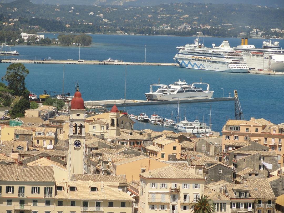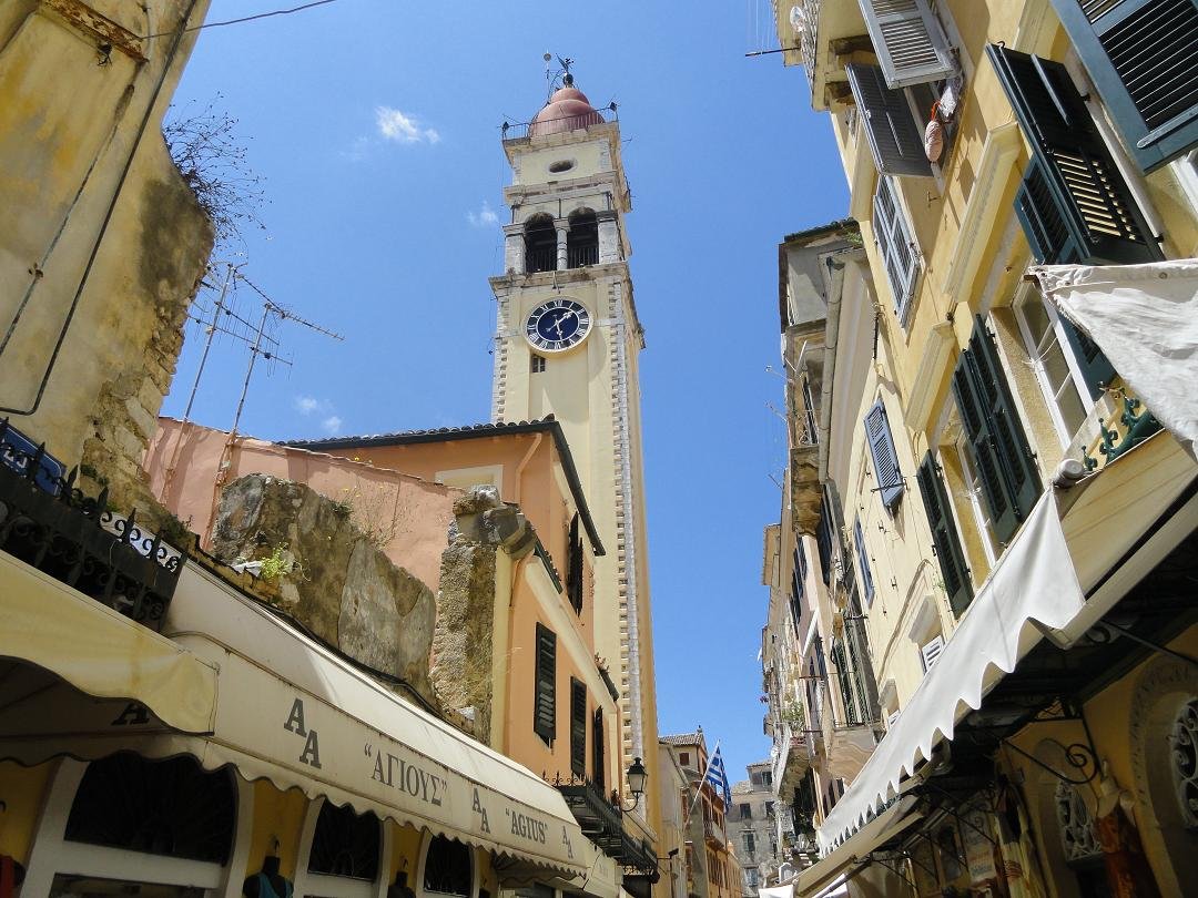 The center of Corfu Town is the so-called "Esplanade," a large square / green (cricket field) surrounded by terraces and a large parking lot. In the Venetian period it was leveled to so it was easy to spot the enemy. The French adorned the field with palms and other trees. The monument with its Ionic columns on the Esplanade was built to commemorate the unification of the island of Corfu with Greece in 1864. To the north of the Esplanade you find the magnificent Palace of St. Michael and St. George. This palace with its 32 Ionic columns was built by the British between 1818 and 1823 and served as a residence for the British high commissioner. After the British left the building came into the hands of the Greek royal family. In front of the palace there is a statue of the second high commissioner of the island, Frederick Adams, who ensured that the water supply on the island was improved by means of an aqueduct system. Symbolically the fountains and ponds on the plot are put there to remember this. Today the building houses the Museum of Asian Art. Behind the Esplanade you find the tangle of numerous wide and narrow streets, alleys, steps and squares. You will find churches and many shops and eateries. This part of the town is car free and it is fun to go and explore it. The houses are unusually high because in the Venetian time the area between the old and the new fortress was surrounded by a city wall. Because the people of Corfu were not allowed to live outside these walls, the houses were increased in height. The old part of Corfu Town therefore makes an Italian impression. |