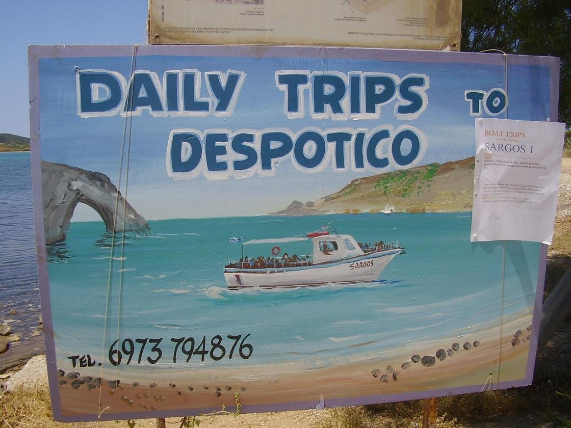 Het eiland Despotico ligt op een afstand van 0,7 kilmeter van Antiparos. Vanwege zijn veilige baai (de zee tussen Antiparos en Despotico) speelde het een belangrijke rol in de maritieme geschiedenis. De baai van Despotico bood een veilige ankerplaats voor de schepen. Er vond handel plaats met het vasteland van Griekenland, andere delen van de Middellandse Zee en Noord-Afrika. Op Despotico zijn overblijfselen uit allerlei periodes opgegraven, waaronder Archa�sche, Klassieke, Hellenistische, Romeinse en van latere datum. In het Archeologisch Museum in Parikia (de hoofdstad van het nabijgelegen eiland Paros) zijn sommige van de mooiste voorwerpen die zijn gevonden tentoongesteld. |