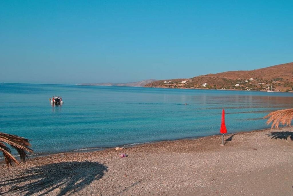 Kalamitsa Beach is situated on the west coast of the island of Skyros, just south of the port of Linaria, and for that reason it can sometimes get a bit busier. It is a long sand and pebble beach that is regularly in the path of the wind and therefore it is popular with windsurfers. The seawater at Kalamitsa beach is very clear. The distance from the beach to the capital Skyros Chora is about ten kilometers. It is an organised beach and there are a number of taverns and cafes, and a surf club (not open yet in May 2018 when we were there, and at that time there were also no sunbeds and umbrellas for rent). Kalamitsa is widely considered the best beach of Skyros (maybe for surfing, but we have seen better beaches such as Magazia, Acherounes, Gyrismata, Kareflou, Limanaki). At the beach of Kalamitsa is the chapel of Agios Mamas, and near are a sarcophagus and a well-preserved column from the Doric time.
