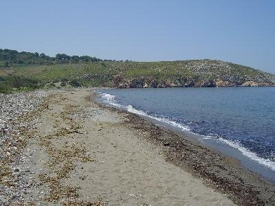 Kampos beach is a beach you will encounter after a right turn on the road to Gavathas in the norteast of Lesbos. The way towards is looks to be a dried out riverbed with elevated houses on either side. There is a river floating over the beach. The beach itself is uncultivated and without umbrellas, chairs and taverna's. The houses are way back from the beach. It looks isolated and it is dirty with litter. In front of the beach there is a view of a small island. Getting into the water it is steep and with pebbles and the water isn't very clear.
