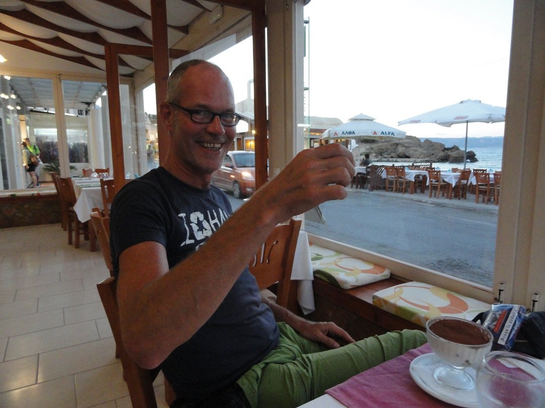 Het Ela Messa restaurant ligt aan de weg bij het strand van Analipsi. De cappuccino komt met slagroom er boven op in plaats van opgeklopte melk en er is ook geen koekje of en glas water bij om het gezelschap te houden. Hij smaakt wel goed en sterk en de bediening is uitermate vriendelijk. Ons oordeel: een 7,5 uit 10 |
