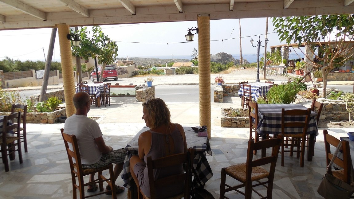 De Kochilas Taverna is gelegen vlakbij het Chrisoskalastissa klooster en kijkt uit op het klooster zelf. Je ziet de taverna aan je linkerhand liggen als je vanuit het noorden naar het klooster rijdt. Wij bestellen een kip souvlaki, een boureki (ovenschotel met courgettes, aardappels en myzitra - een geitenkaas), lamskoteletjes en bifteki (een soort gehaktbal). Alles wat we besteld hebben smaakt erg lekker, vooral de boureki, en ook de frietjes zijn heel smakelijk. Ons oordeel: een 9 uit 10 |