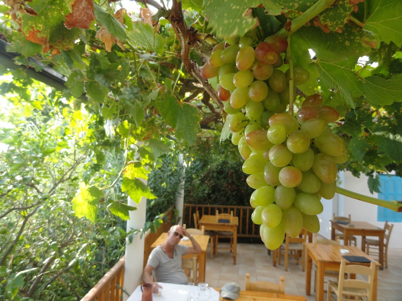 Kiknos Cafe ligt aan de boulevard die langs het strand van Kalamaki loopt. Ze verkopen er eenvoudige gerechten en snacks, zoals pizza's, broodjes, yoghurt, omelettes en verschillende soorten ontbijtjes. Wij bestellen er dan ook geen haute cuisine maar een cappuccino en een yoghurt met honing en walnoten. De koffie is prima en lekker sterk, Lavazza, en er wordt een flesje water bij bezorgd. De yoghurt is ook prima, maar daar valt natuurlijk niet veel aan te verpesten. Bediening is door een heel aardig meisje dat ons na afloop nog een groot bord druiven (gratis) komt brengen. Ons oordeel: aangenaam en vriendelijk, een 8,5 uit 10 |