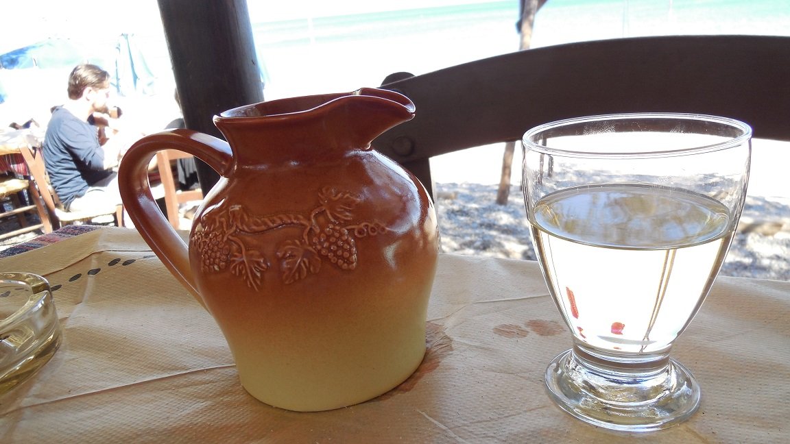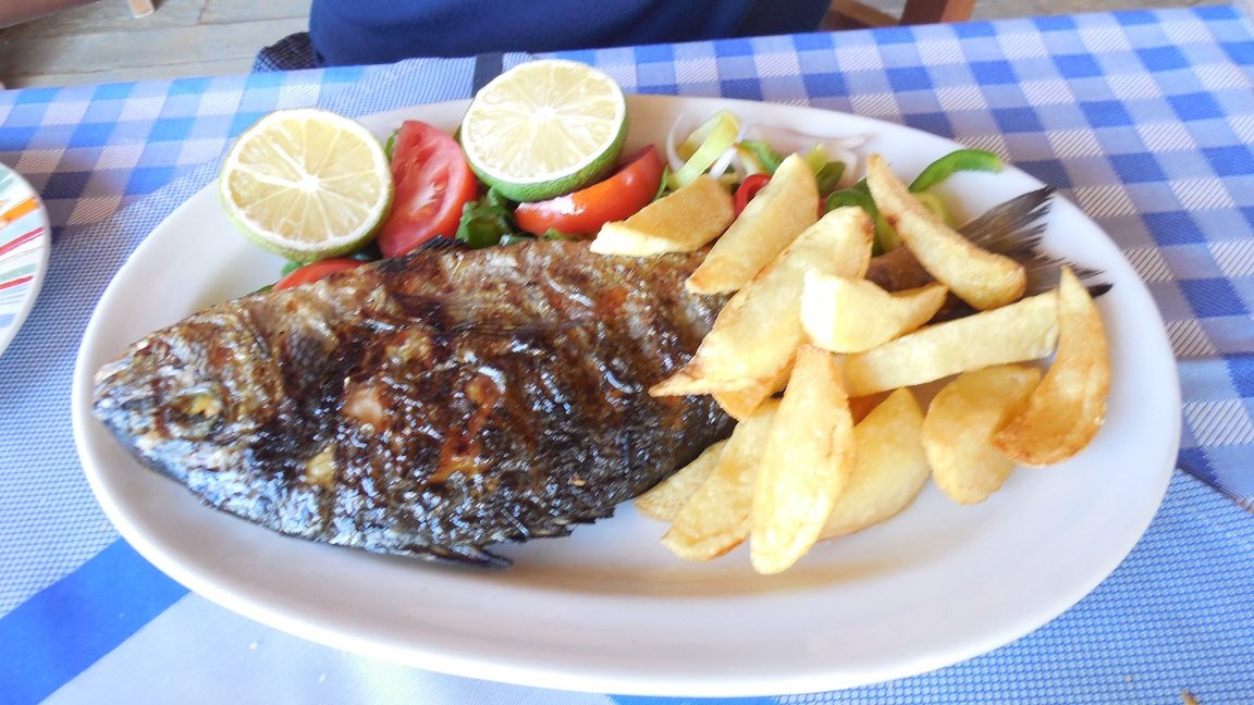 Het Kalathas restaurant ligt aan het strand van Kalathas naast de rivier. We bestellen er een vis, gevulde tomaten, wijn en een tzatziki. De bediening is vriendelijk en alles smaakt prima. De frietjes zijn lekker knapperig. Ons oordeel: een 8,5 uit 10 |