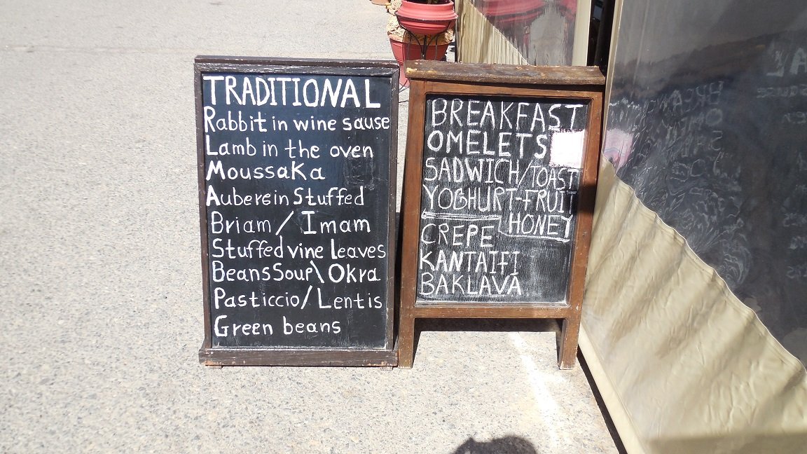 Kefali is een klein bergdorp waar je doorheen rijdt als je onderweg bent naar het Chrisoskalitissa klooster of het eiland Elafonisi in het zuidwesten van Kreta. Het dorp stelt niet zoveel voor: een paar kleine hotels, een paar kleine winkeltjes die tegelijkertijd als minimarket, coffeeshop en taverna dienen, en een paar huizen. Als je uit Duitsland komt of als je de taal kunt begrijpen is het wel een bezoek waard voor deze menukaart op de foto. Je kunt ook de rustieke en roestige toiletdeur bewonderen die bij deze taverna hoort en de vrouw met de snor die er bedient. Kijk maar wat voor speciaals ze allemaal op de kaart hebben staan! Geen oordeel maar we vonden het bord met het menu erg leuk |