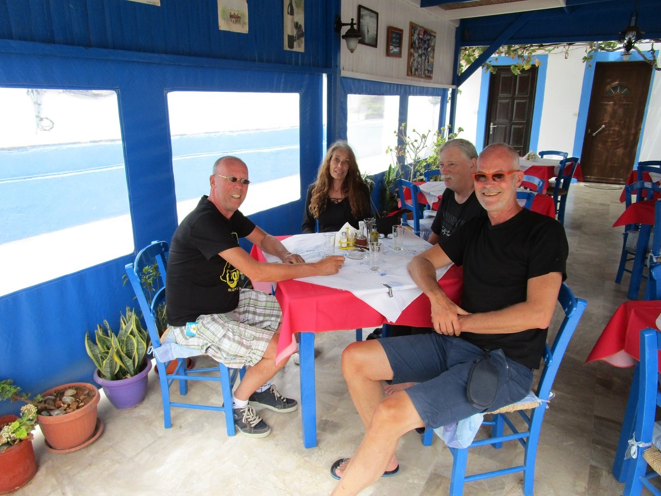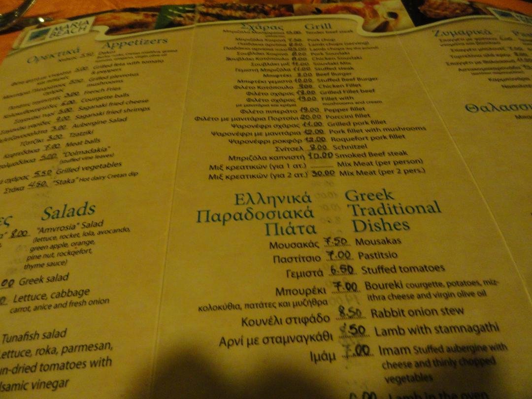 Een taverne met een zeer uitgebreide menukaart ge�llustreerd met foto's. Die krijg je aangereikt wanneer je gaat zitten aan een van de tafels. Dit leek de drukste taverna in de rij van de taverna's in de haven, dus we dachten deze taverna ook eens te proberen. Ze hebben erg veel visgerechten op het menu. We hebben de tonijn salade geprobeerd, het knoflook brood (dat was goed), rode bieten salade, spagetthi bolognese, tong (geen graten maar smaakloos en we denken - of zijn er zeker van -dat het uit de diepvries kwam en dus niet vers), franse frietjes (zacht, niet knapperig) ... kortom, het was een soort van teleurstelling. Daarnaast stond er de hele tijd voetbal op de televisie aan (dit verklaart misschien waarom het zo druk was, het kan niet vanwege het goede eten zijn), en leken we daardoor "onzichtbaar" te zijn - dat wil zeggen: niemand die oplette of je iets wilde hebben of of je misschien af wilde rekenen: een slechte service. Ons oordeel: vooruit dan maar, nog een 6,5 uit 10 (restaurant bestaat niet meer) |