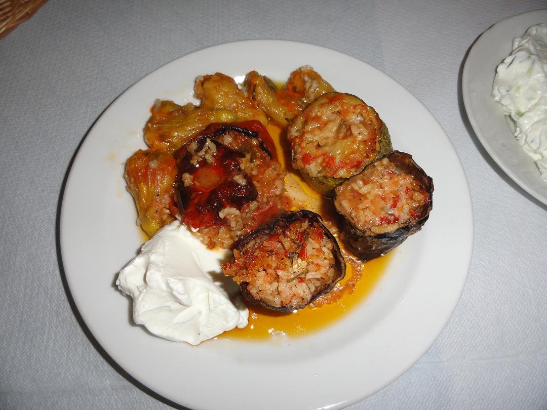 Ondertussen zijn we al verschillende malen terug gegaan naar George's Taverna en hebben diverse andere gerechten uitgeprobeerd, zoals de dolmadakia (gevulde wijnbladeren), de mousaka, de stifado (zacht rundvlees met uien) en de bonen. Eigenlijk was alles steeds in orde en de bediening is elke keer weer even vriendelijk. Ons oordeel: een 9 uit 10 |