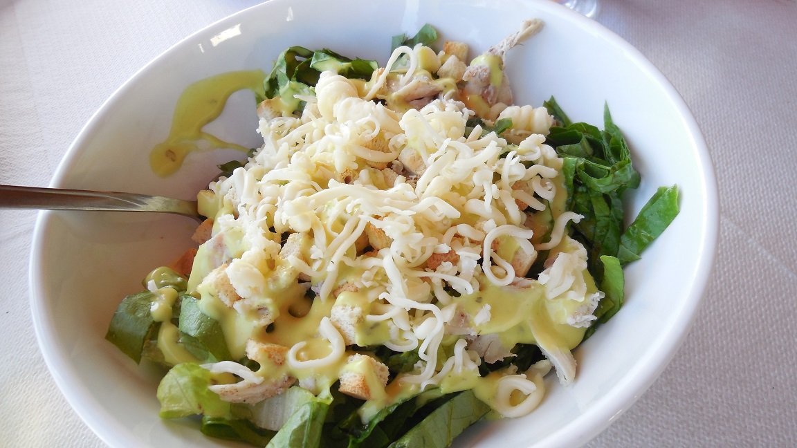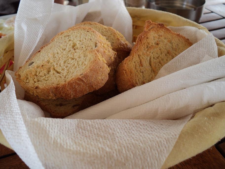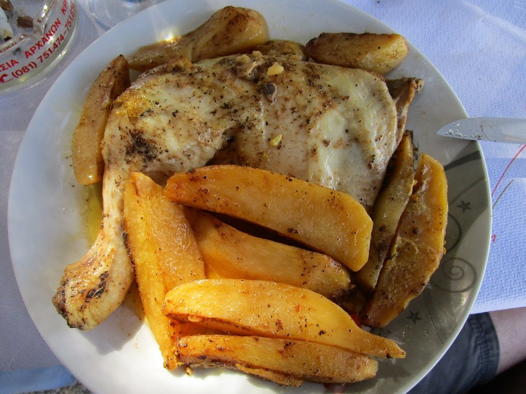Hier in Koufos in de lokale taverne wilden we even een klein hapje eten. Ontbijt of lunch, het zat er een beetje tussenin. Toen we vroegen of ze ontbijt serveerden was het antwoord "ja" maar toen we vroegen of ze iets met eieren hadden, moest het eerst nagevraagd worden en was het antwoord "nee". Ze stelden de zelfgemaakte crepes met kip voor waarvan we twee porties bestelden. Deze waren goed te eten en we kregen er gratis een bord lokale kaas bij, die ook best lekker was. Minpuntje was het brood, want dat was geen brood maar van die harde brokken (soort van grote) croutons die je normaal in de dakos (een ander Grieks gerecht) vindt waar ze zachter worden. Jammer van het brood, maar geen klachten over de rest van het eten. Ons oordeel: een 7 uit 10 |