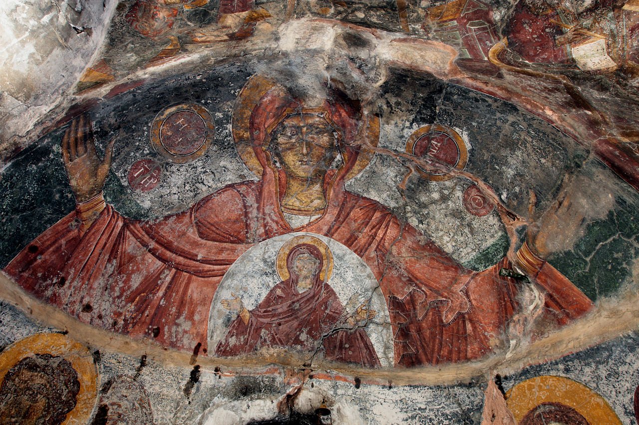 One kilometer before the village of Kritsa, in the site named "Logari" is the old Byzantine church of "Panagia Kera", with unique in technique and importance Byzantine frescoes (14th and 15th century). The central aisle, dedicated to the Assumption of the Virgin, contains the oldest paintings which reflect a mixture of styles. The south aisle has the best-preserved paintings. In contrast to the more stylized paintings of the period, these paintings display a tenderness and humanity in their rendering of the story of Anna, the Virgin Mary's mother. The north aisle is dedicated to St. Anthony and has pictures representing the Second Coming. |