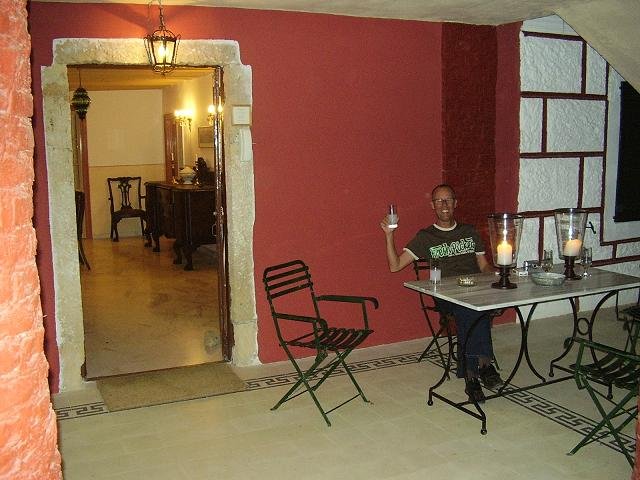 Op Leros zijn minder hotels dan op de omliggende eilanden, zeker vergeleken met de niet veraf gelegen eilanden Samos en Kos, waar de keuze uit hotels veel breder is. Voor de lente van 2007 was ons oog gevallen op het Hotel Archontiko Angelou in het dorp Alinda. Dit hotel is een luxe verbouwde Italiaanse villa, en werd door een van de bewoners van het eiland omschreven als het meest romantische plekje van Leros waar je heerlijk kon ontbijten in de bloementuin. Het hotel zag er prachtig uit, dus voor Leros werd het voor ons even een paar dagen luxe. De eigenaresse Marianna was heel vlot met de e-mails en had het over haar "guesthouse" maar ik vond het zelf meer een klein palazzo. De kamers in Archontiko Angelou waren echt prachtig en schitterend gemeubileerd, kort samengevat: superchique. Ik las er ook goede recenties over op het internet. Voor ons dus waren het echt een paar dagen om naar uit te kijken. |
