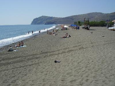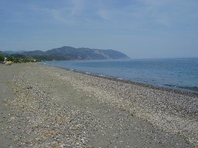 Een van mijn favorietje dorpjes op Lesbos is Skala Eressos in het westen van het eiland, in een waanzinnig mooie baai gelegen, en met een prachtig groot strand (met mogelijkheid voor nudisme). Het heeft een van de mooiste en meest dramatische stranden van heel Griekenland en een rij cafees en restaurants aan het water die niet commecieel maar gewoon heel gezellig aandoen. Op deze plek kom je echt helemaal tot rust, want het is ver weg van alle drukte van de toerisenplaatsen. Skala Eressos heeft ook overblijfselen van een middeleeuws kasteel, en een mozaikvloer uit de 5e eeuw na christus (achter de nieuwe kerk liggen de resten van een oude basiliek). Het is overigens ook niet ver van het versteende woud en het leuke kustdorpje Sigri. De omgeving van Skala Eressos is adembenemend mooi, met prachtige bergen en mooie vergezichten op de zee. |