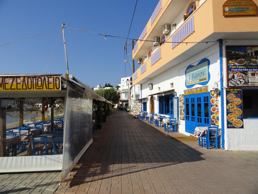 Taverna Faros ligt aan de boulevard die langs het strand van Makrigialos loopt. Ze verkopen er voornamelijk visgerechten en er staat een vriendelijke man in de bediening. Wij bestellen de "sole fish", de garnalen en fava. De fava is echt verrukkelijk en de vis en de garnalen zijn in orde. Er wordt vers brood met roomboter bij geserveerd. Ook de wijn is goed. De frietjes zijn wel te eten maar ze zijn niet knapperig. Ons oordeel: een 8 uit 10 |