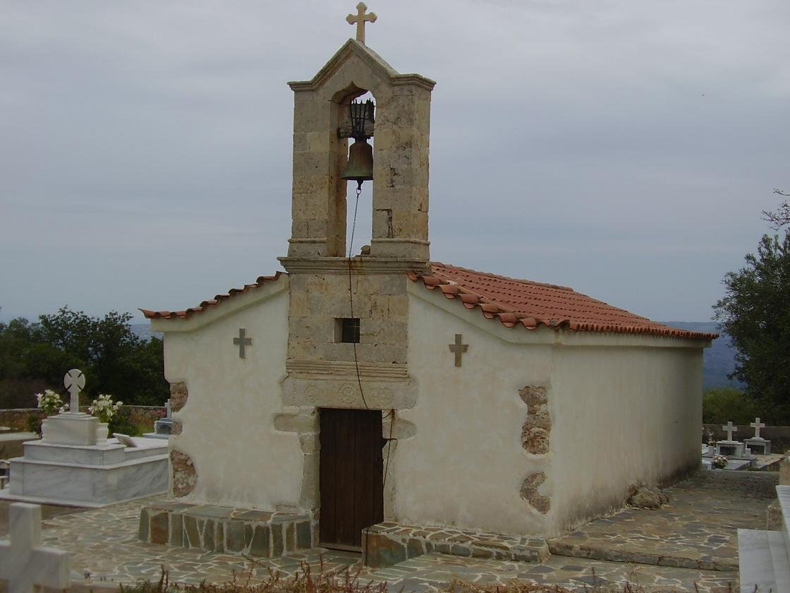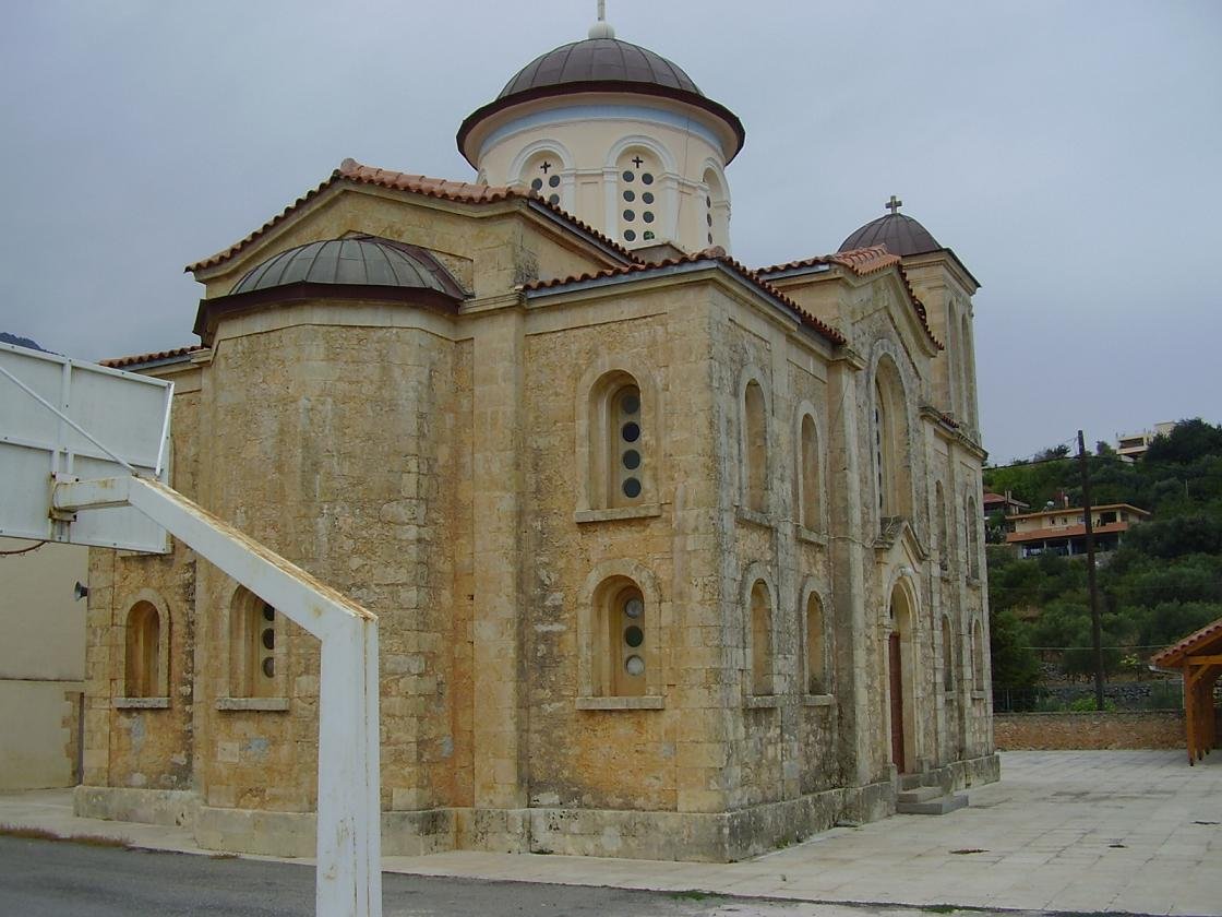 De grote opvallende kerk van het dorp met zijn koepel en twee torens is echt prachtig. Hij lijkt wel van een soort zandsteen gemaakt te zijn. Vanaf het plein dat om de kerk heenloopt heb je schitterend uitzicht over de Apokoronas en de baai van Souda.