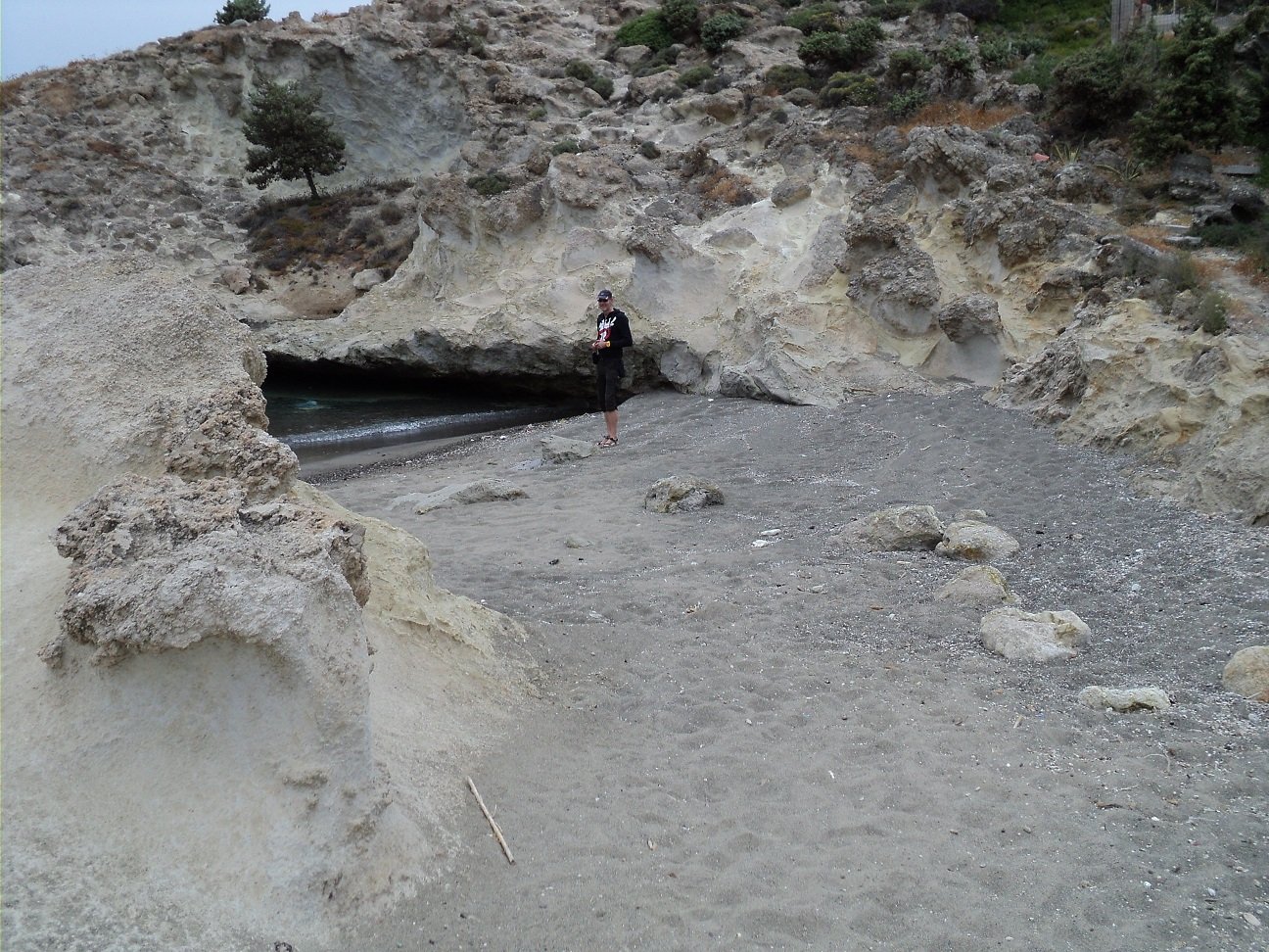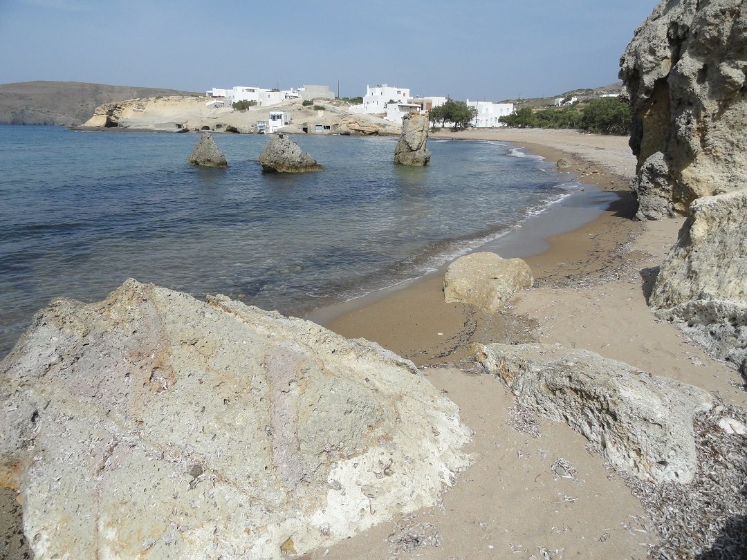 Strand naast de opgraving van Phylakopi , tussen Phylakopi en Pollonia en op ongeveer 3 kilometer afstand van Pollonia. Het is een van de meest bijzondere stranden van het eiland Milos. Je kunt er komen over een smal pad. Vanaf de top van de rots ziet het strand eruit als een turqoise zwembad (kanaal) met hoge witte rotsen eromheen, en er zijn grotten. Op de dag dat wij er kwamen helaas een beetje somber weer, dus het water was wat minder mooi van kleur als normaal. |