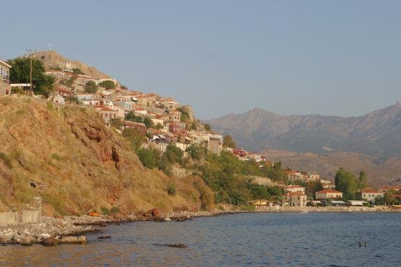 | HET DORP EN STRAND VAN MOLYVOS OF MITHIMNA OP HET EILAND LESBOS IN GRIEKENLAND |