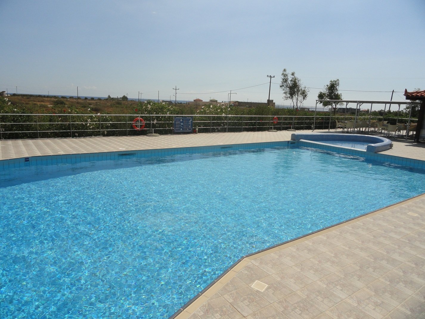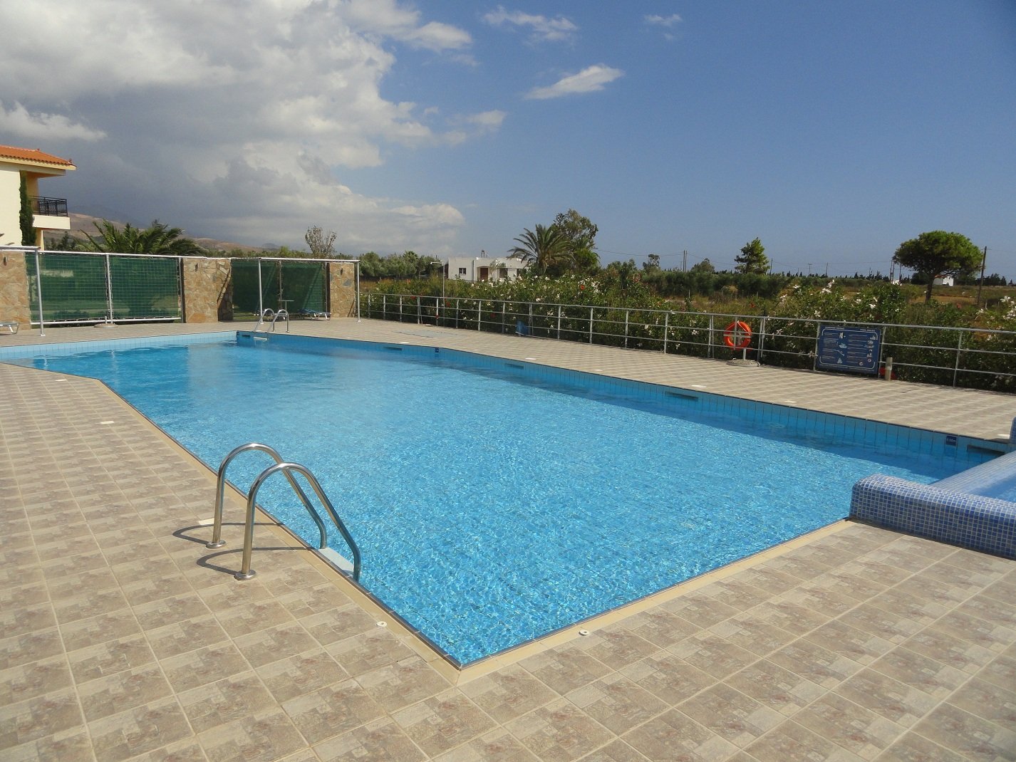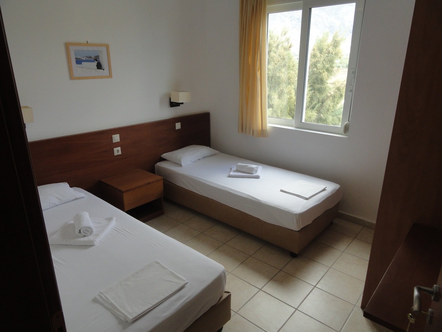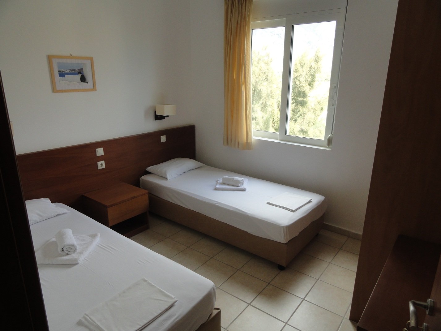Wij verbleven hier een aantal dagen in september in een appartement met twee slaapkamers. Er was een woonkamer met een bank en een sateliet-tv, een goed uitgeruste kitchenette met allerlei apparatuur (koffiezetapparaat, waterkoker, broodrooster, diverse pannen, keukengerei, serviesgoed, glazen) en een eettafel met stoelen. We hadden twee slaapkamers, een met een tweepersoonsbed en een met twee eenpersoons bedden. Verder was er een badkamer met douche en toilet. Alles was brandschoon en het werd ook regelmatig bijgehouden, inclusief de ramen die werden gelapt, schoon beddengoed en handdoeken en een complete schoonmaak. De woonkamer had openslaande deuren naar een lekker grote veranda waar een tafel met stoelen stond. Vanaf deze varanda had je uitzicht op de zee en op het fort van Frangokastelo. In heb een filmpje gemaakt om een beetje een indruk te geven van het appartement en het uitzicht. |