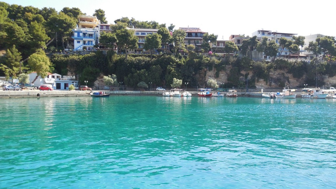 Alhoewel de haven en het dorp van Patitiri, waar de veerboten aanleggen, beduidend kleiner is dan Skiathos stad, prefereerde ik het over zijn grotere buurman. De haven is heel knus, met veel bomen en bloemen, en er zijn ook veel mensen die vreemde vogels in een kooitje voor hun huis hebben hangen. De terassen in de haven waren rustig, het eten was er goed, en de mensen erg aardig. Veel verkeer is er niet. Aan de rechterkant van het dorp is een klein keienstrandje, en er zijn een paar straten met aardige winkeltjes, supermarktjes en een bakker. In Patitiri zijn pinautomaten en er is een "Health Centre". Vanaf de kade vertrekken excursiebootjes naar de diverse attracties die Alonissos te bieden heeft, zoals de kustlijn, de blauwe grot, het Marine Park en nabijgelegen eilandjes met stranden, een vuurtoren en een klooster. Wat ook mijn aandacht trok was een grote oude muur in het midden van de haven, die overwoekerd was met bomen en struiken. Je kunt langs de haven lopen of over de pier, maar je kunt ook een trap op om de stad en de haven van bovenaf te bekijken. Mijn vrienden zijn naar de Chora (hoofdstad) gelopen. |