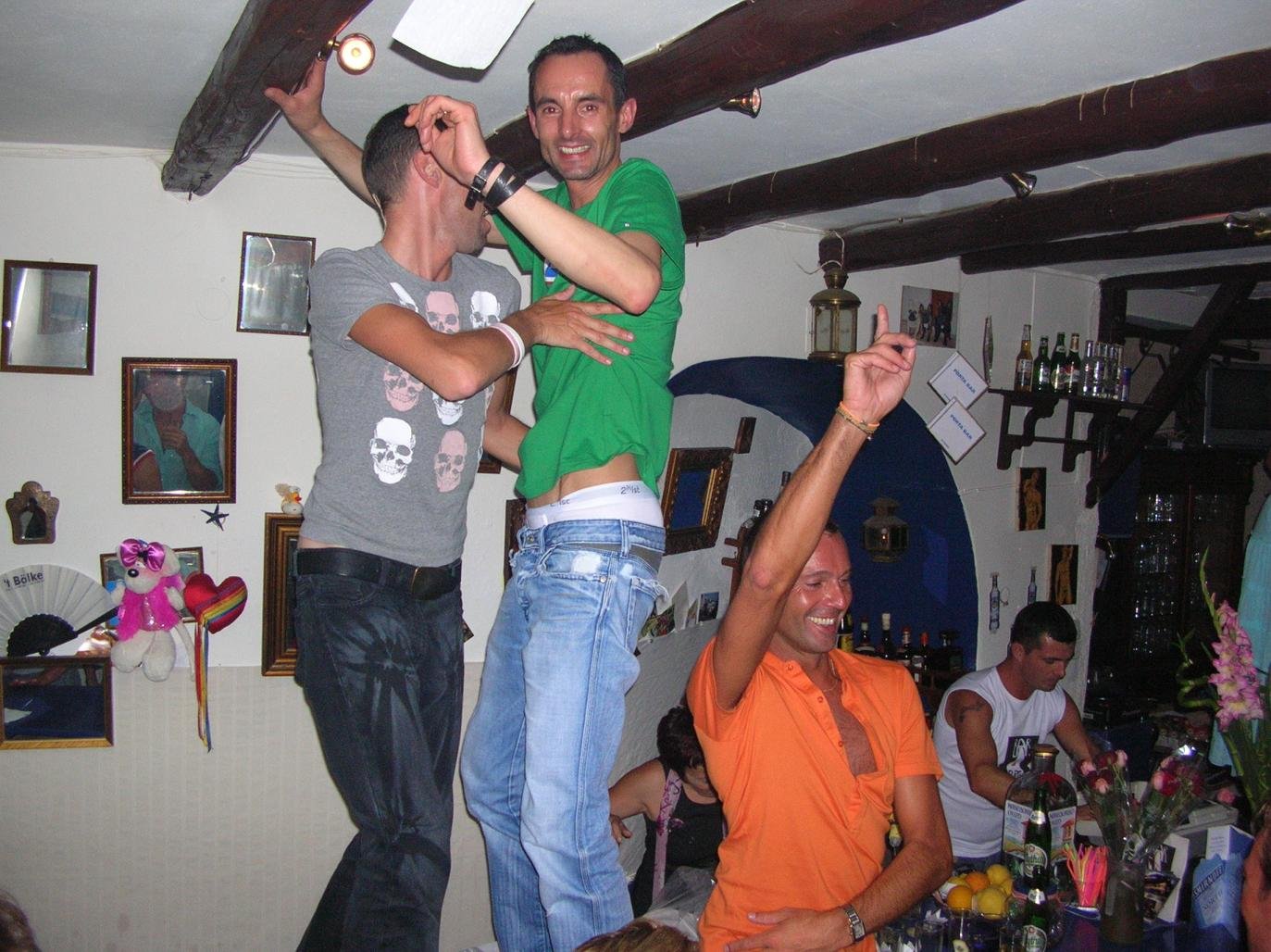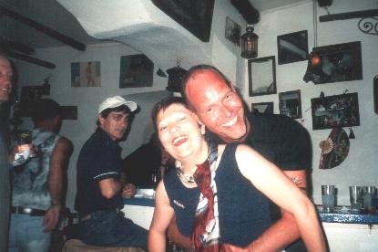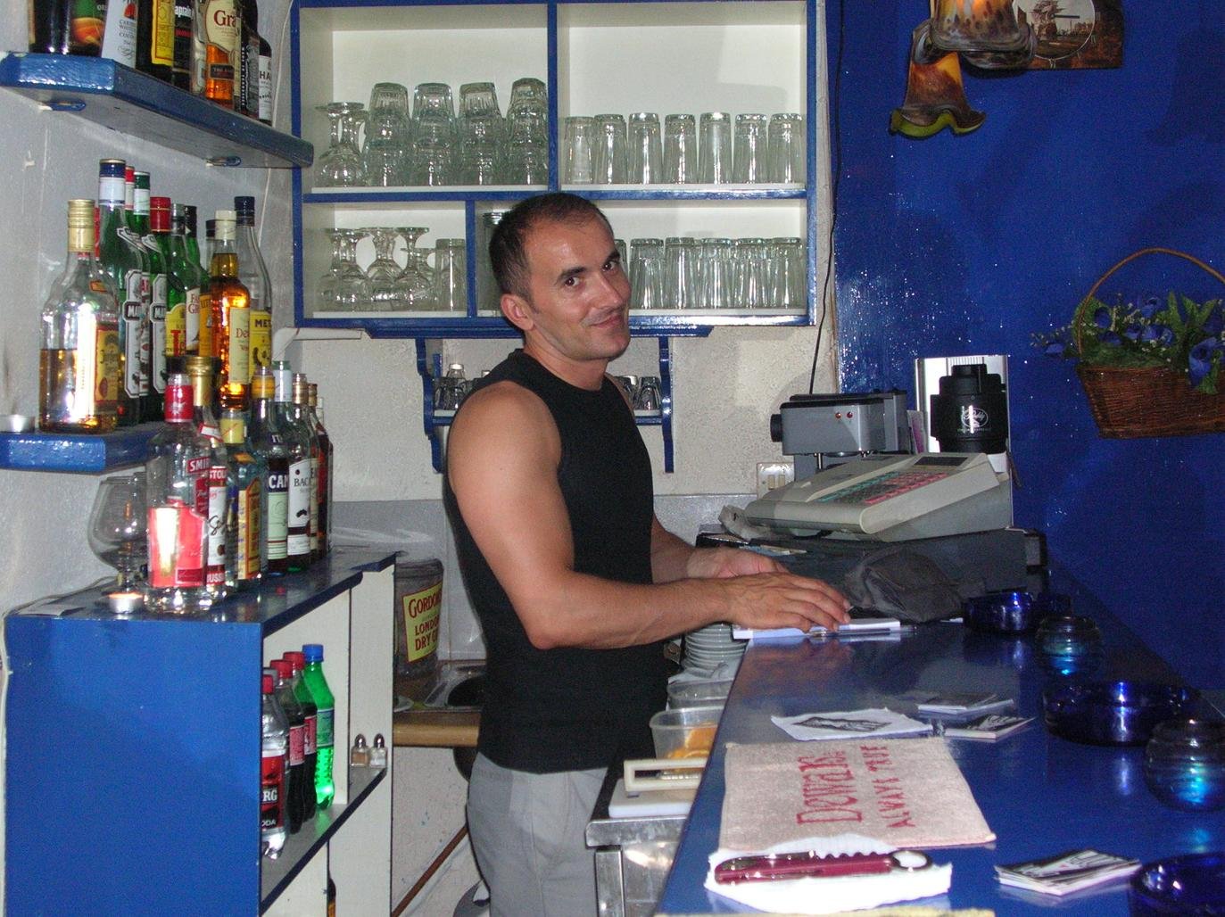 Hier zijn een paar foto's van mijn favoriete bar op het eiland. Het is een beetje moeilijk te vinden, want het zit in een achteraf straatje. Als je op de boulevard loopt zit er op een hoek een winkel met ikonen (tegenover het kleine kerkje aan het water). Dat straatje ga je in en dan volg je je oren richting de herrie.
