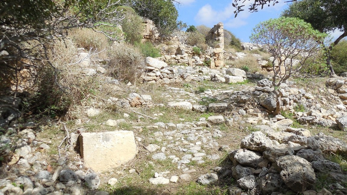 It is already worth to go and see the village of Rokka itself. It has about 100 inhabitants, is located at an altitude of 210 meters, has stunning views, a nice church, beautifully restored houses and some beautiful old dilapidated buildings. It is a very peaceful and traditional Cretan village without facilities. There is also no tavern or kafenion in the village. At the church, which dates from 1888, a few relics have been put down that were found at the site of Ancient Rokka which is situated next to the modern village, such as (I think) a nicely carved part of a column and a type of grinding stone. There is also a part of an old wall with very large stones, probably the remains of the city wall. In all likeliness a part of the modern Rokka was built on the ancient Rokka.