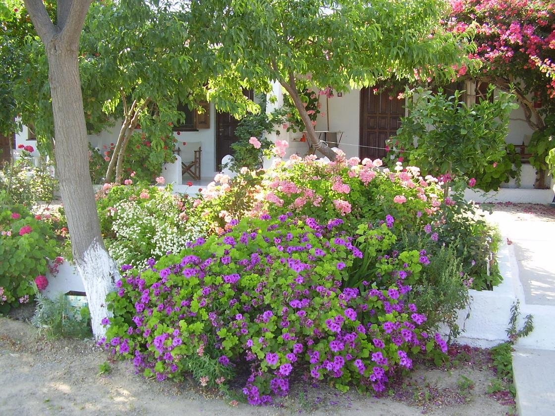 De "studios" zijn eigenlijk een soort huisjes met een laag muurtje over de helft van de ruimte in het midden waardoor er een soort afscheiding ontstaat tussen de bedden / het bed en de woonkamer en de keuken. Het plafond is vrij hoog (ik denk zo'n 3,5 meter met een puntdak van hout). De studios zijn heel groot. Het woonkamer gedeelte heeft een grote u-vormige bank waar met gemak nog twee mensen zouden kunnen slapen. Daar tegenover is de keuken waarin je alles kunt vinden dat je maar nodig hebt: waterkoker, koffiezetapparaat, broodrooster, oven, kooktoestel, borden, schalen, glazen, koffieservies, bestek... er is ook een grote badkamer en een veranda met zeezicht. De huisjes staan in een l-vorm rondom een leuke bloementuin die Ioanna zelf onderhoudt. Er zijn allerlei soorten bloemen en bomen (bougainvillas en pruimenbomen bijvoorbeeld) en dat alles heel rustig en mooi gelegen. Het dorp, de mensen, de stranden en Ioanna zelf zijn redenen genoeg voor mij om snel weer naar Samos en naar Limnionas terug te keren. Ik werd er aangenaam door verrast. Hieronder en boven staan de foto's die ik heb gemaakt van Studios Ioanna en van het strand toen ik er was. Het is gemakkelijk te vinden. Als je het dorp binnen komt rijden is het aan het begin aan de linker kant van de weg en het staat goed aangegeven. Limnionas trekt een speciaal soort mensen aan: degenen die het oude authentieke Griekenland opzoeken. Ze komen er voor de rust en niet voor de uitgaansgelegenheden en het nachtleven. Veel van hen zijn rugzaktoeristen en mensen die een beetje avontuurlijk zijn ingesteld en houden van wandelen, mooie natuur en rustige (of lege) stranden. Meer foto's en informatie over Limnionas en de stranden in de omgeving kun je HIER vinden. |