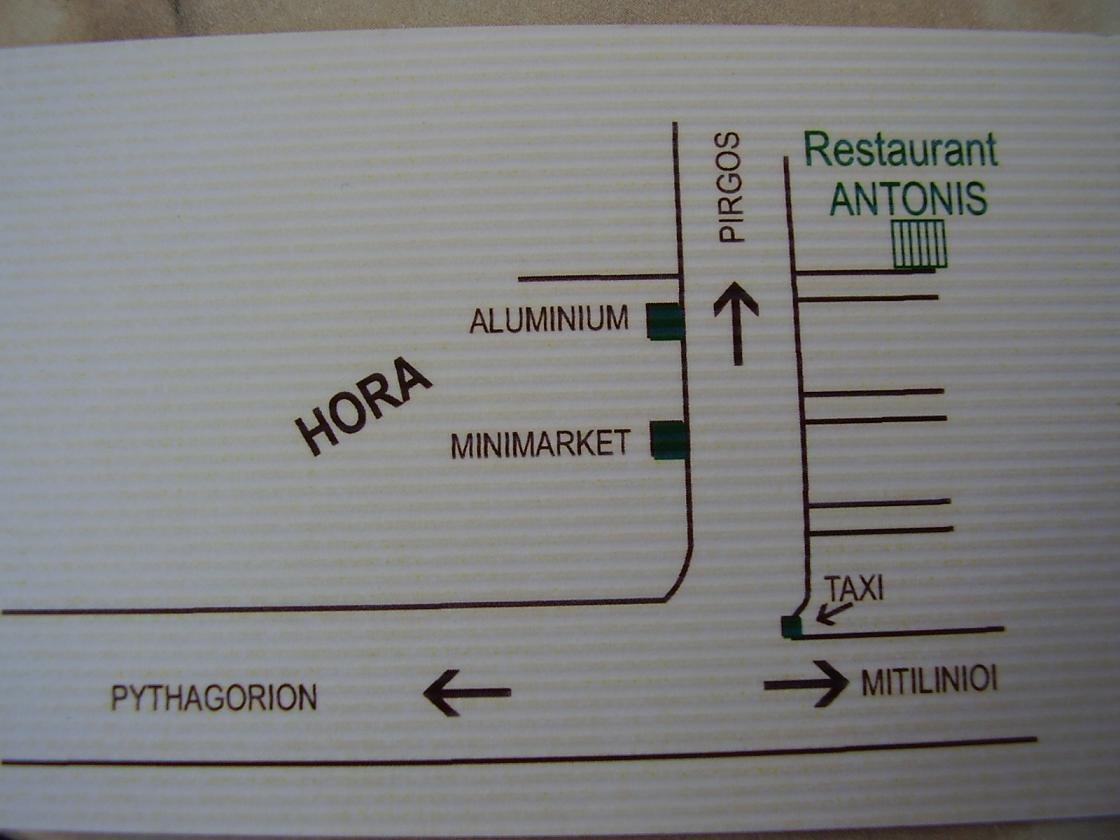 SORRY, VERKOCHT EN HEEFT NU EEN ANDERE EIGENAAR, DUS HET OORDEEL HIERONDER IS NIET MEER UP TO DATE. Antonis Tavern zit vlak na de splitsing in Chora als je vanaf Pythagorion komt en richting Pirgos gaat (derde straatje rechts - zie ook de plattegrond op de eerste foto links boven). Antonis ligt op een soort groot terras met in de hoek twee bomen, waarvan eentje een olijfboom is die is uitgegroeid nadat iemand blijkbaar een olijfpitje hier had laten vallen. Deze taverna wordt geroemd, wordt de hemel ingeprezen door de "Guide de Routard" (de Franse variant van de ANWB gids), en wordt ook vermeld in het Nederlandse ANWB gidsje. Wij kwamen er eten op aanraden van de lokale bewoners die zeiden dat het echt fantastisch was. De eigenaresse/kokkin is superlief (foto's bovenste rij rechts met het rode shirt) en kookt echt de sterren van de hemel. Er is een kaart waar je van kunt bestellen, maar je kunt ook vragen of ze gewoon wat kleine gerechtjes willen brengen die lekker zijn. Wij hebben er van alles geprobeerd (helaas zijn we er maar twee keer geweest) en ik vond alles wat er neer werd gezet erg lekker. Er was een preitaart/quiche, het geheime eier-gerecht, heerlijke tzatziki, smakelijke salades, zalige kipfilet, de smalle groene Griekse pepers gevuld met f�ta-kaas, gefrituurde kikkererwten balletjes, gegrilde hamburgers en zelfs de octopus salade was om je vingers bij af te likken (terwijl ik daar normaalgesproken niet zo'n fan van ben). Antonis, die de bestellingen opneemt en af komt leveren spreekt een beetje engels en is heel bescheiden en vriendelijk. Ach, kon ik er morgen maar weer wat gaan eten... KLOPT NIET MEER: Ons oordeel: waanzinnig, een van de beste taverne's die we ooit bezochten - een 10 uit 10 |