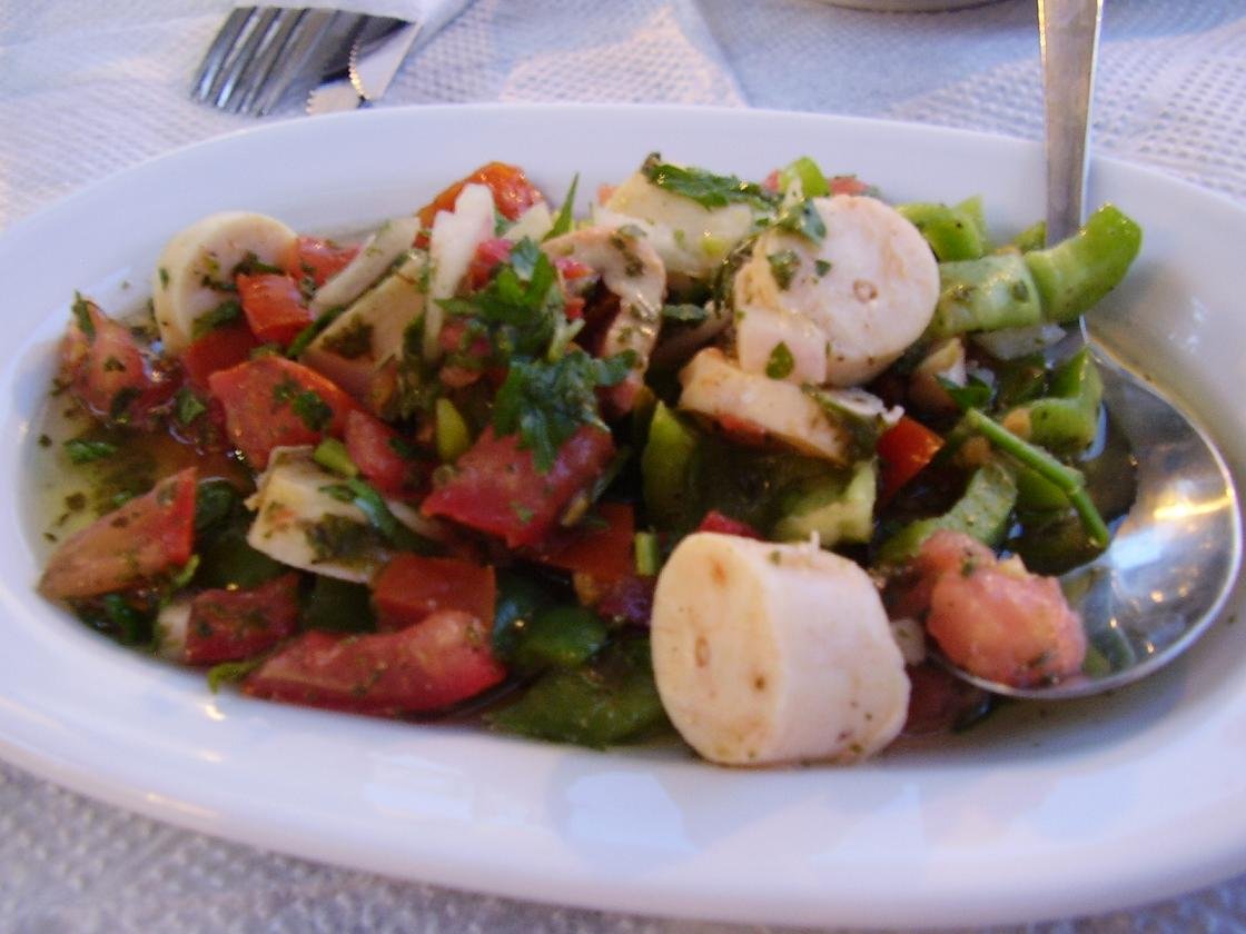 Dit dorp niet ver van Pythagorion was een stuk rustiger en we hebben er dit leuke restaurant aan het water getroffen. Het heet Aigaio en voor ons was het eten en de rust een reden om er nog een keer terug te komen. De eigenaar Markos is een vriendelijke man die hier en daar wat brood op de grond strooit omdat de musjes zijn vriendjes zijn. De tzaziki met wortel en komkommer (en volop knoflook) smaakt prima en de witte wijn is heerlijk, en je kan hem in echte wijnglazen schenken (met een steel eraan, dat gebeurt niet vaak in Griekenland). Beide keren bestelden we de Aegean salade omdat die erg goed was. Er zit ham in en eieren, feta, verschillende soorten olijven, uienringen, tomaten, komkommer, sla, cocktailsaus en verse kruiden (de eerste keer dille en daarna een ander soort kruid). Ook goed waren de aubergineschijven (eggplant) met knoflooksaus, de lever (alhoewel de uitjes wat te lang hadden doorgebakken), de saganaki (gebakken kaas) en de kipsouvlaki. Ons oordeel: 8 uit 10 |