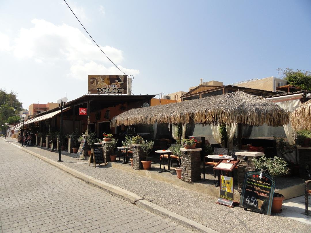 Nice looking caf� on the corner of the of the main access road and the beach of Kamari. They have amongst other things different types of breakfasts, cakes, desserts, coffee, ice cream, omelettes, yoghurt and sandwiches. We order a cappuccino and apple pie with ice cream. The apple pie is warm and like the ice (with whipped cream) it tastes delicious. The coffee is good and they bring us a glass of water. Friendly service by a guy. Our verdict: very good, a 9 out of 10 |