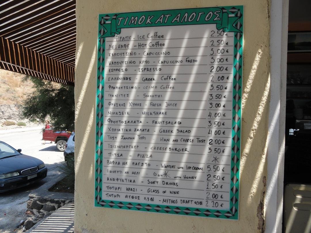 Situated on a corner on the right hand side of the main road as you drive into Perissa. We order an English breakfast here. The coffee is nescafe (which we don't like), but the rest is okay. There is toast, marmelade, butter, white beans, sausages, bacon and eggs, tomatoe, cucumber and a glass of water. It is all very cheap (5,90 euro in 2011) and not bad at that price. Friendly people. Ons oordeel: reasonable to good, a 7,5 out of 10 |