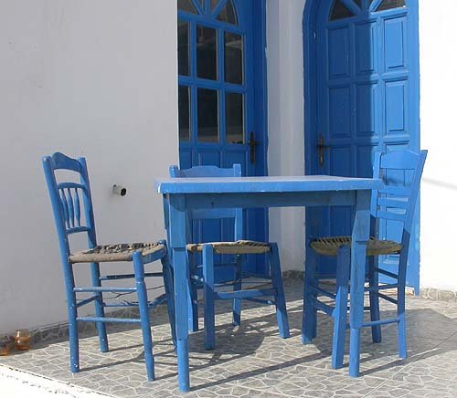 De mensen die nu op Schinoussa wonen stammen af van bewoners van het eiland Amorgos, die weer het eiland weer gingen bevolken rondom 1800. Chora bestaat hoofdzakelijk uit ��n straat en het is aantrekkelijk, ondanks dat er niet zo veel oude gebouwen zijn. Je vind er drie heel kleine mini markets, waarvan er tenminste twee ook vers brood verkopen. Deze zijn gesloten tijdens de si�sta tijd, zo ongeveer tussen twee en zes uur. Er is een leuk pleintje waar je iets kunt eten en drinken en er zijn voldoende andere eetgelegenheden. Er zijn twee verkooppunten waar je tickets voor de veerboot kunt halen: een in de hoofdstraat en een even daarachter in de buurt van de kruising van de weg die naar Messaria gaat. Die in de hoofdstraat was in mei alleen tussen 8 en 10 uur in de avond open. De andere daar weet ik geen openingstijden van. In de hoofdstraat zagen we ook een geldautomaat en in een zijstraat vind je het Folklore Museum. Het sfeertje in de Chora en op het hele eiland gezellig en de mensen zijn echt supervriendelijk. Het is alsof je een stuk terug gaat in de tijd. Iedereen kent elkaar en ook de toeristen worden vriendelijk door alle bewoners begroet. |
