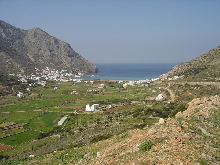 Another major attraction of the island is a row of fine beaches in the south, of which Vathi, which is situated in its own mini bay, is the best. There is also a taverna here. You can get to Vathi by bus over the new road, or you can get there by kaik from Kamares. There is also a path that leads to the coastal village of Platis Gialos, with its taverna's, rooms for rent and some smaller hotels. This is the "main beach" of Sifnos. The length of this beach is somewhat exaggerated when I read about it. It is supposedly one of the largest sandy beaches in the Cyclades, or it is even the largest one and 6 kilometer long. I was there and I estimate it is maybe 1 kilometer long and not very wide. Somewhere towards the end of May all the shops and the restaurants were still closed. We understood it didn't open up untill June. People that want to stay in Sifnos before that period are better off booking an accommodation in Kamares or Faros, where there is a bit of life and most of the shops and taverns are opened. Faros is situated a little bit more to the southeast and it's a popular village with three small beaches. |