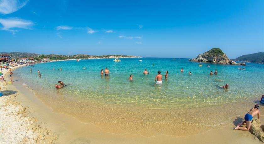 Sarti is a coastal village which is located on the southeast side of the Sithonia peninsula, about 140 km away from Thessaloniki. It is named after the ancient city of Sarte that stood in this area in the classical period. There are still some remnants of a reinforcement and of the old town south of Sarti towards the direction of Sykia. Modern Sarti developed around 1922 when immigrants from Asia Minor settled here as immigrants because of the Turkish-Greek war. Nowadays Sarti is one of the main holiday destinations in Sithonia. There is a beautiful view of the Athos peninsula. Besides the main beach there are several smaller bays in the area. On the main beach you can rent sunbeds and umbrellas. Tourism has therefore become the main branch of industry here.