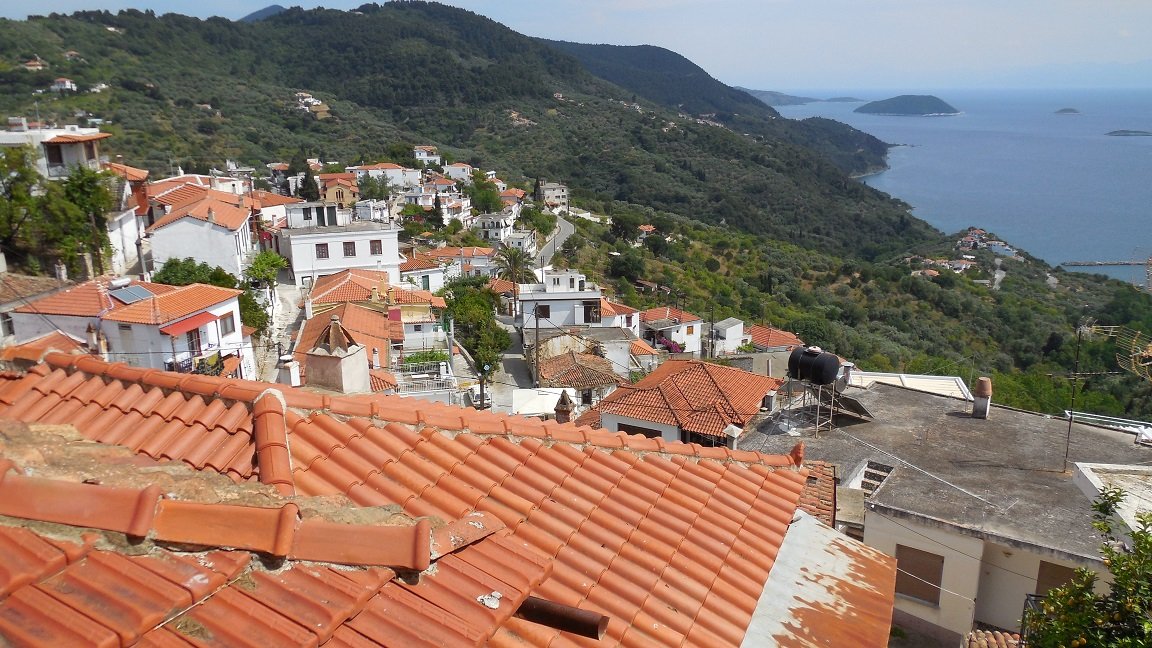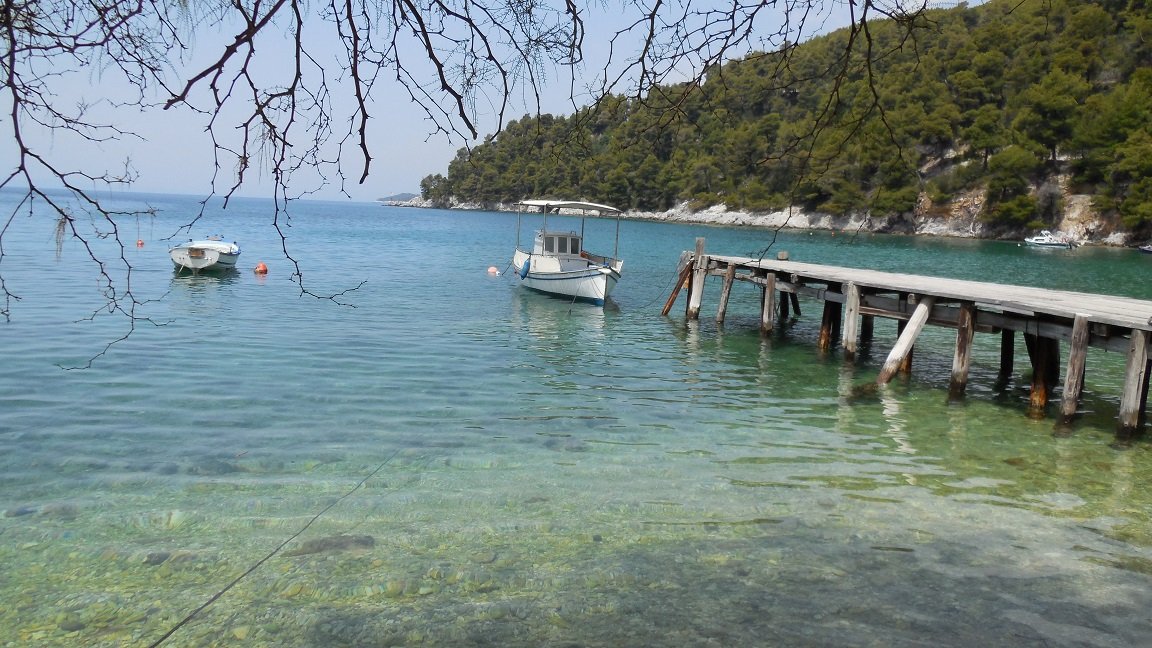 Voorzover ik kon zien tijdens onze boottocht was het landschap op het hele eiland erg mooi. Skopelos heeft nog een andere havenstad, Agnontas, die in het zuiden van het eiland ligt en waar de veerboten aanleggen als er veel wind staat vanuit het noorden. In dat geval zijn er gratis bustochten naar Skopelos stad. Agnontas heeft een schilderachtig kiezelstrand en ligt in in een baai waar het water prachtig groenblauw van kleur is. Er zijn een paar taverna's en er zijn wat accommodaties, maar echt groot is het niet. Er staat een grote boom op het strand die voor wat schaduw zorgt en er liggen wat houten vissersboten in het water. Af en toe zie je er misschien een vrachtboot in de haven liggen. De andere haven aan de andere kant van het eiland waar de veerboten regelmatig aanleggen heet Loutraki, dat net beneden op een na grootste dorp van het eiland ligt. Dit dorp heet Glossa. In Loutraki vind je een paar antiquiteiten, zoals bijvoorbeeld e Romeinse baden (te vinden aan je linkerhand als je naar de zee kijkt, aan het einde van het strand en dan nog over een paar rotsjes klimmen om er te komen. Het zijn overigens maar een paar stenen). In Loutraki zijn ook eetgelegenheden en er is een supermarkt. Er is ook een strand, maar veel stelt het niet voor. |