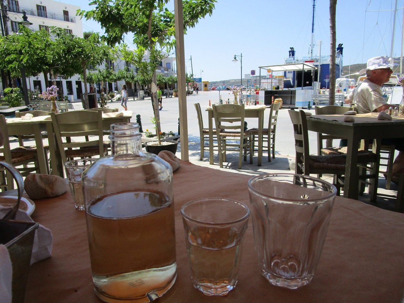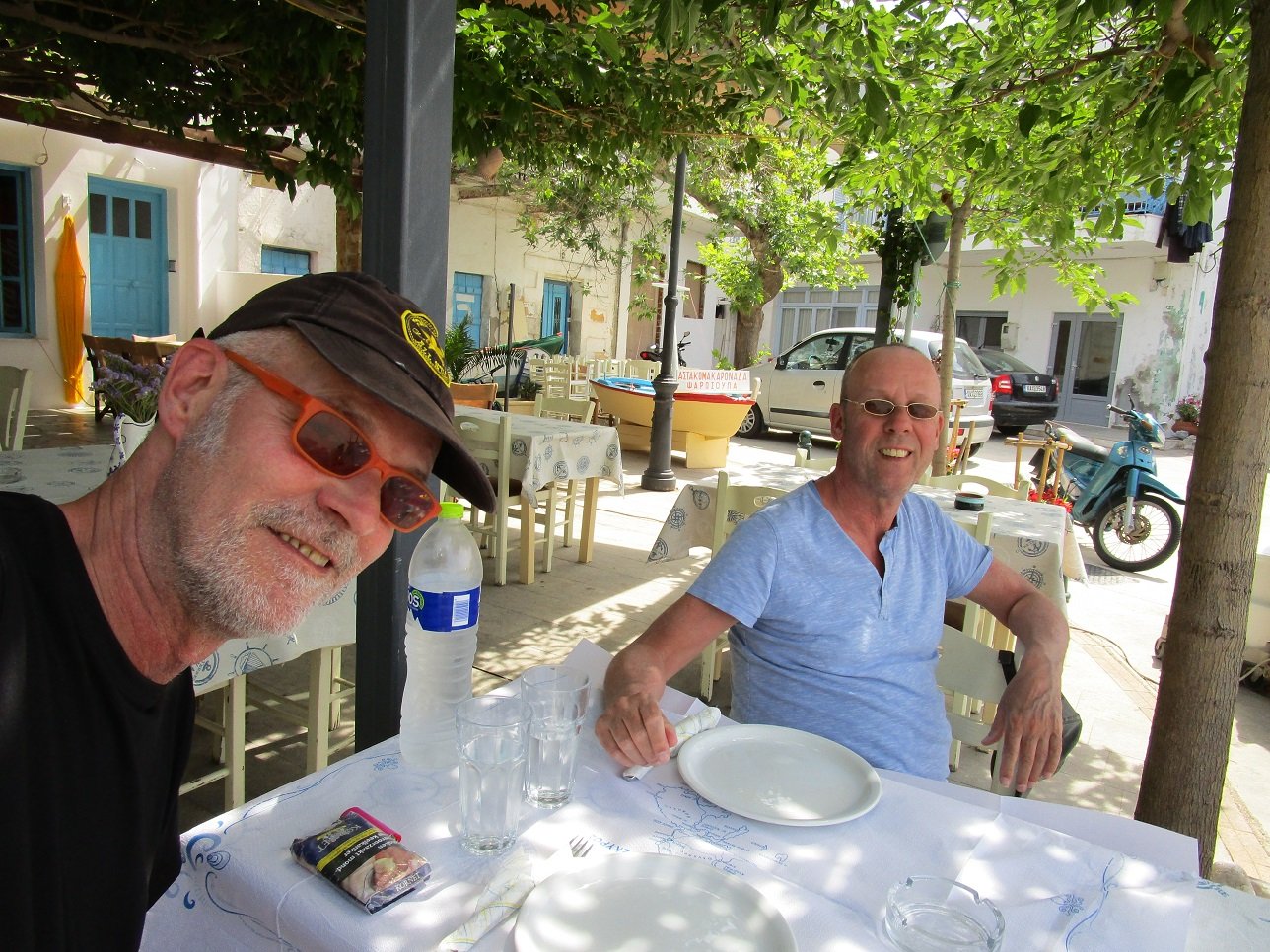 Taverna Gialos is gelegen bij een van de trappen die naar het strand van Magazia lijd. We bestellen er de gezouten gebakken vis, de gehaktballetjes, de Griekse salade en een halve liter wijn. Het eten is simpel maar niet onsmakelijk en de bediening is vriendelijk. Ons oordeel: een 6 uit 10. |